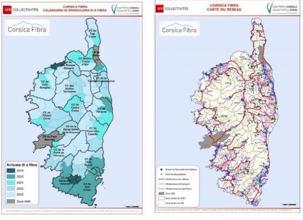 [Mis à jour le 09/11/2018 : nouvelle carte de déploiement et calendrier de construction publiés par SFR à l'occasion de la signature de la DSP Corsica Fibra]