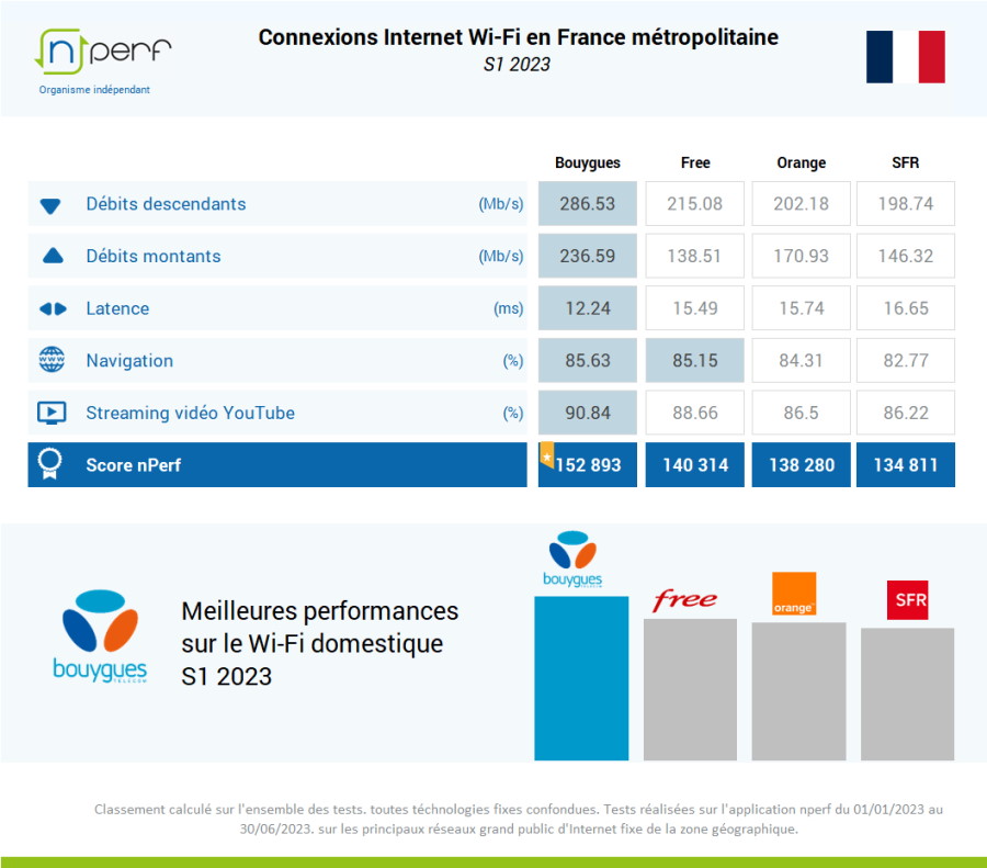 Même si les quatre principaux opérateurs, Orange, Free, Bouygues Telecom et SFR proposent un débit Wi-Fi performant, l'un d'entre eux se détache spécifiquement, avec un Wi-Fi encore plus rapide qu'au premier semestre 2022. Parmi les quatre opérateurs, l'un excelle avec un débit descendant moyen de 286 Mb/s, alors que ses concurrents plafonnent à 215 Mb/s, 202 Mb/s et 198 Mb/s.