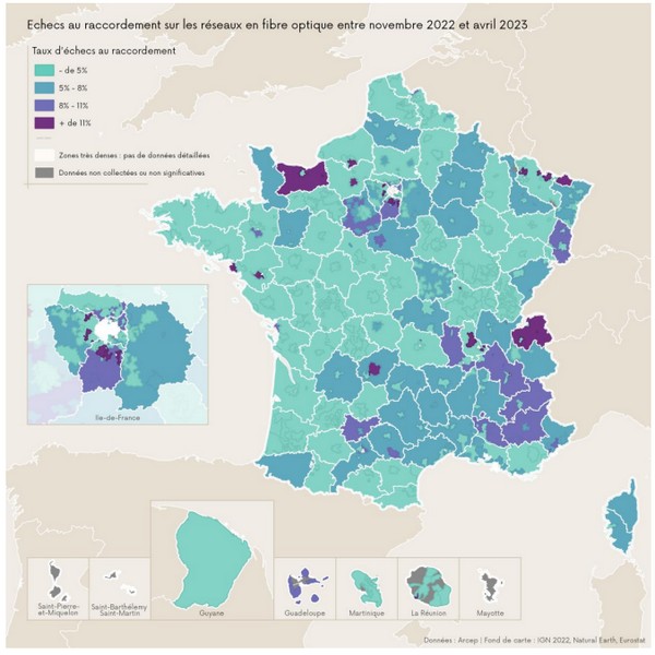 Pour le reste, dans certaines zones moyennement denses où la fibre est déployé par Altice (SFR), comme dans l'Eure, en Seine-Maritime, la Saône-et-Loire, le Puy-de-Dôme ou encore les Yvelines, on observe aussi des taux d'échecs au raccordement supérieurs à 10%, notamment dûs à une mauvaise conception initiale. D'ailleurs, Altice s'est également engagé sur un plan de reprise de ses réseaux dégradés.