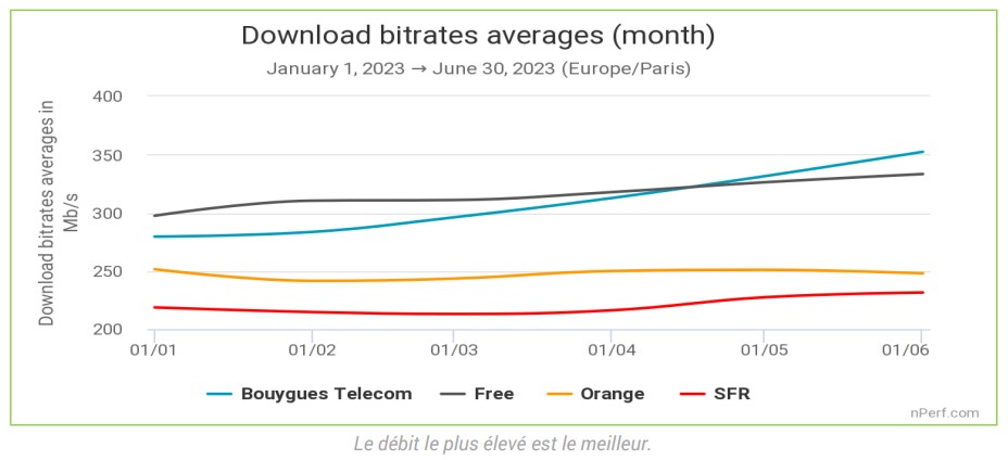 Entre janvier et avril 2023, Free dominait clairement ses concurrents sur le débit descendant. Mais c'était sans compter sur Bouygues Telecom, qui a enregistré un "taux record de 350 Mb/s" selon nPerf. En moyenne, entre janvier et juin, c'est tout de même Free qui domine sur le débit descendant, mais, si Bouygues Telecom poursuit ses efforts, il pourrait se retrouver premier aussi sur les débits descendants.